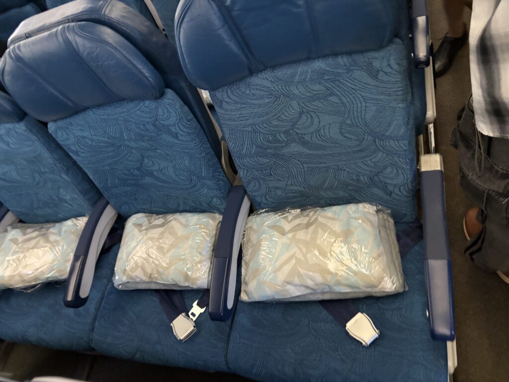 今回は真ん中の座席でした。座席にはよくあるブランケットと枕が予めセットされていました。
