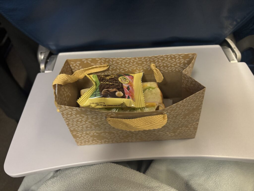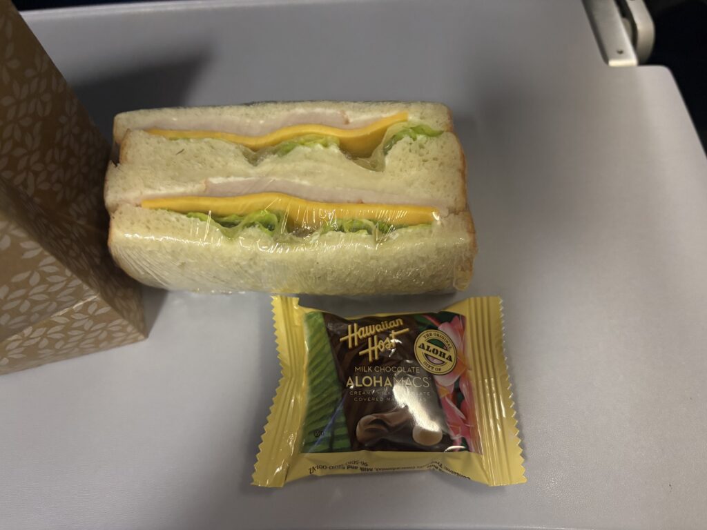 サンドイッチとハワイアンホーストのお菓子でした。最後までハワイ感を感じられますね。わがままですが、ここにボトルウォーターも入っていれば嬉しいなと思ったところでした。。。